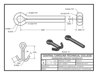 This drawing shows a gear puller tool used to remove cotter pins. It was drawn by K. Thorpe on November 20, 2014 at a scale of 8:1. The gear puller has several rounded features including the jaws that grip the gear, with dimensions provided in inches. It will be used to assist the removal of cotter pins from mechanical components.