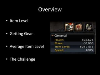 The document discusses gearing up a character in World of Warcraft to reach an average item level of 550. It explains that each item has an item level rating, with higher numbers indicating better gear. Gear can be obtained through random world drops, dungeon drops, raid drops, and vendors that sell gear for justice or valor points. Reaching item level 550 would require running dungeons and raids at various difficulty levels to collect the highest item level gear, as well as upgrading eligible pieces using valor points. Players are challenged to inspect a level 90 character and outline a strategy for obtaining the necessary items to reach an average item level of 550.