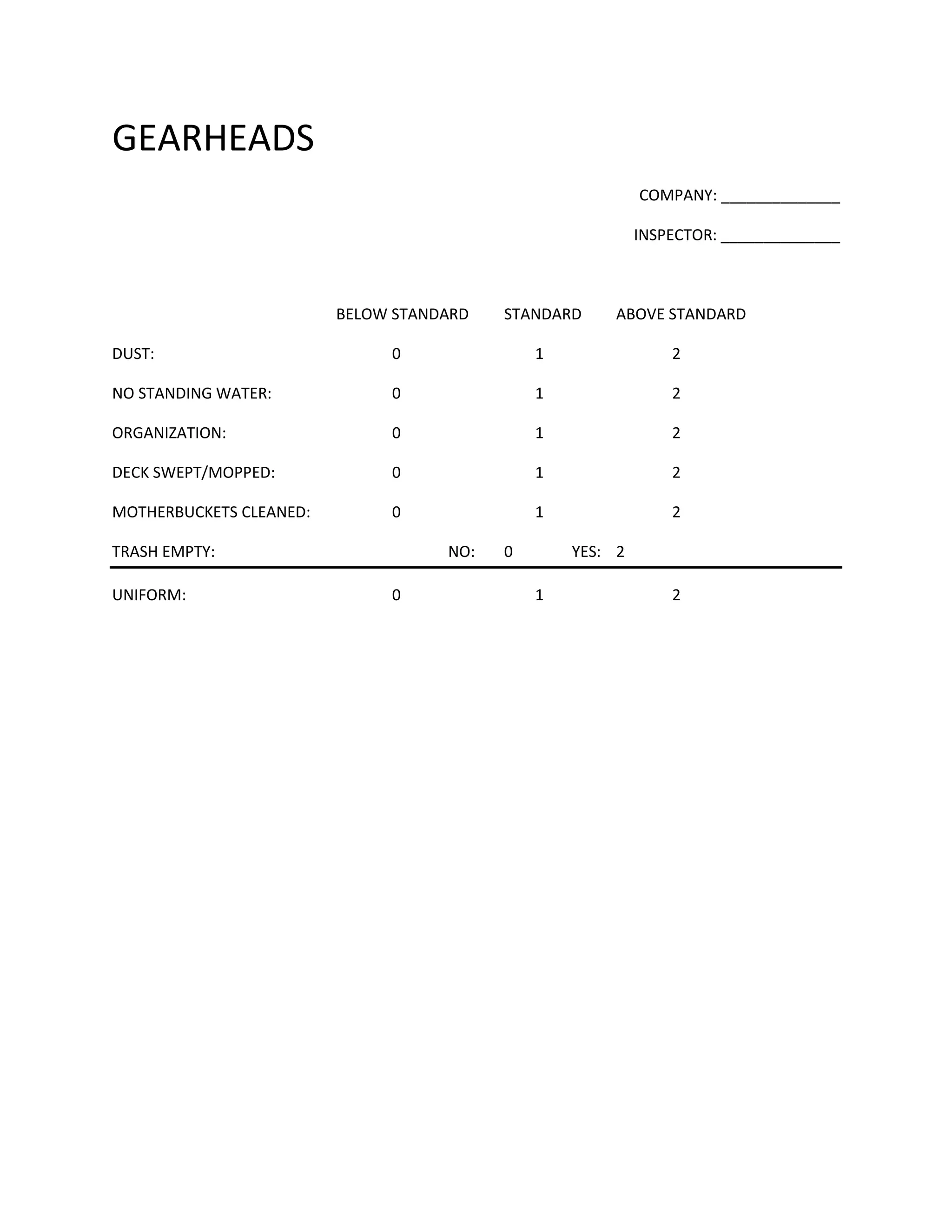 This document appears to be an inspection checklist for a company. It lists various standards like dust, standing water, organization, cleaning tasks, and uniforms being inspected and rates them as below, at or above the standards. The inspector and company name fields are blank.