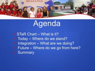 The document discusses the Academy at West Birdville's progress in technology integration based on the Texas STaR Chart evaluation system. It provides an overview of where the school currently stands according to the STaR classifications, initiatives underway like the use of document cameras and curriculum software, and plans to improve through staff development, campus visits, and preparing for 2020 expectations.