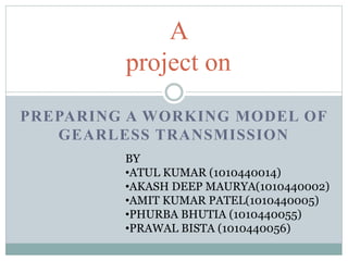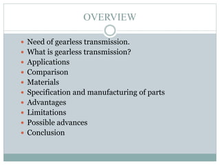 This document describes the development of a working model of a gearless transmission. It discusses the need for gearless transmission to increase efficiency. The working principle involves using bent links to transmit power between shafts at 90 degrees without using gears. Construction details and materials used are provided. Advantages include lower cost and ability to transmit power at any angle, while limitations include lower torque capacity and fixed speed ratio. Possible future applications are in automation and robotics.