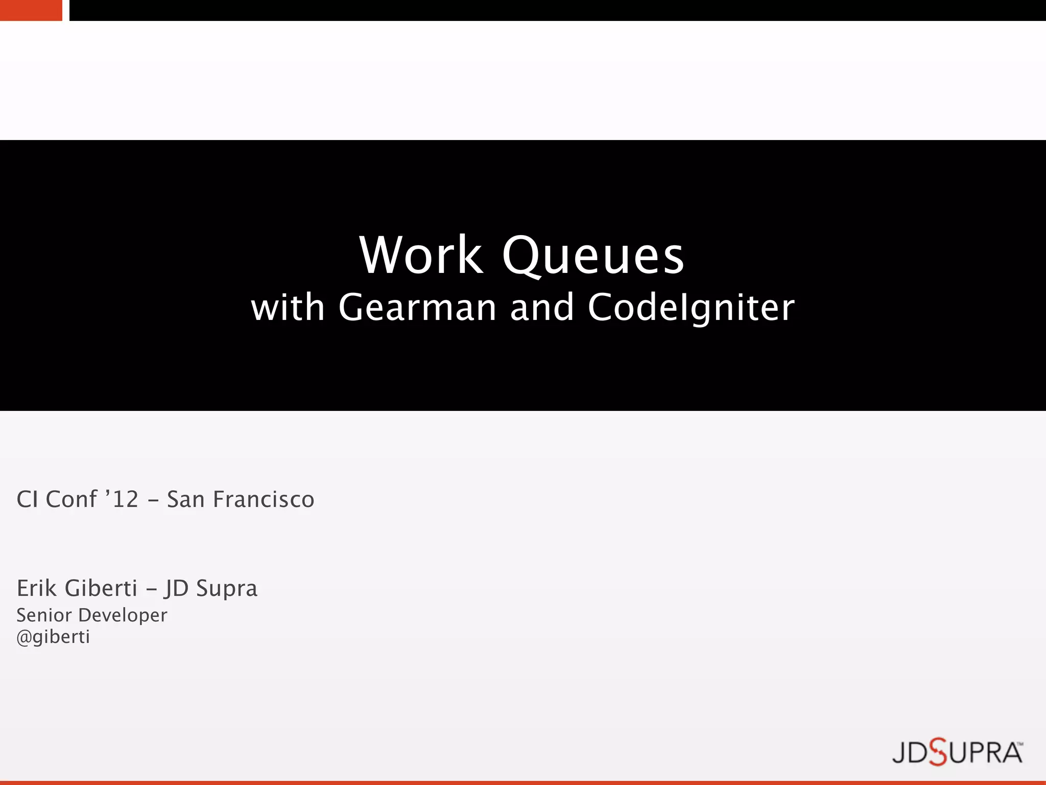 The document discusses work queues, particularly using Gearman and CodeIgniter, explaining how they handle data processing through a job/worker model. It highlights the benefits and challenges of implementing work queues, including issues related to race conditions, database resource management, and the persistence of data across servers. Additionally, it covers the installation and configuration of Gearman, emphasizing its suitability for real-time processing and cross-language compatibility.