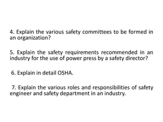 This document outlines several safety-related topics and questions for consideration in industrial settings. It asks about safety factors for hydro-testing and electroplating processes. It also asks about safety protocols in paint shops. Additionally, it inquires about forming safety committees in organizations and the safety requirements for using power presses as recommended by a safety director. Finally, it asks about explaining the Occupational Safety and Health Administration (OSHA) in detail and the various roles and responsibilities of safety engineers and safety departments in industries.