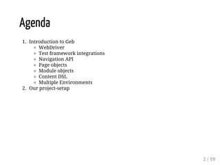 The document introduces Geb, a browser automation framework built on WebDriver, enabling effective automated testing of web applications with a Groovy-based API. It discusses features such as page and module object structures, integration with testing frameworks like Spock and JUnit, and environment configurations. Additionally, it provides examples and resources for better understanding and implementation of the framework.