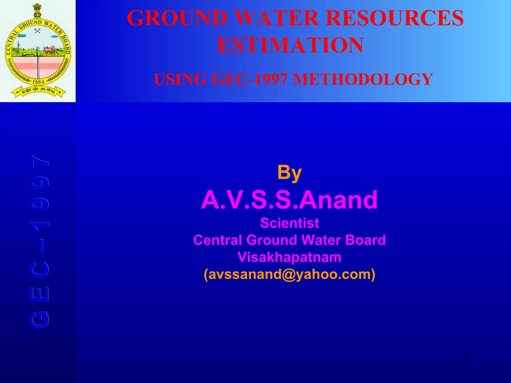 The document discusses methods for estimating groundwater resources using the GEC-1997 methodology. It describes estimating various components of groundwater inflow and outflow, including precipitation, surface runoff, evapotranspiration, groundwater draft, and recharge from sources like canals, irrigation, and water structures. Key steps involve computing groundwater draft, recharge from other sources, rainfall recharge, and summary details to determine net groundwater availability.