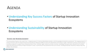 The document discusses the key success factors and sustainability of startup innovation ecosystems, based on research and data collected from various global cities. It highlights important elements such as talent, infrastructure, economic assets, and enabling environments, while emphasizing the role of networking and community-building activities as crucial connectors for startup success. Findings indicate that while support programs are beneficial, long-term sustainability depends on the maturity of the support infrastructure and local ecosystem dynamics.