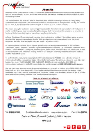 Amelecs’ product line includes GEC industrial controls and a range of signal conditioning modules with proven analog technology suitable for various industries including nuclear, power, oil & gas, and food processing. The company offers extensive compatibility for upgrade and replacement parts with a ten-year warranty, ensuring reliability and compliance with industry standards. Client feedback highlights the longevity and quality of their products, enhancing customer satisfaction and support.