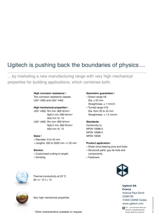 Ugitech is introducing new duplex steel bars with very high yield strengths for building applications. The bars have two corrosion resistance classes, UGI 4362 and UGI 4462, with minimum yield strengths of 690 MPa and 800 MPa respectively. The bars are available in diameters from 6 to 45 mm and lengths from 500 to 6500 mm. They are suitable for applications requiring high corrosion resistance and mechanical properties such as shear pins, bolts, structural parts, and fasteners.
