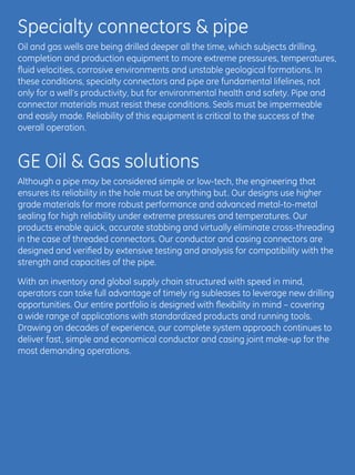 GE provides specialty connectors and pipe for oil and gas wells that are subjected to extreme pressures, temperatures, and environments. Their products are designed using advanced materials and testing to ensure reliability under harsh conditions. They have a global network of manufacturing and service facilities equipped to deliver customized solutions and support customers anywhere in the world.