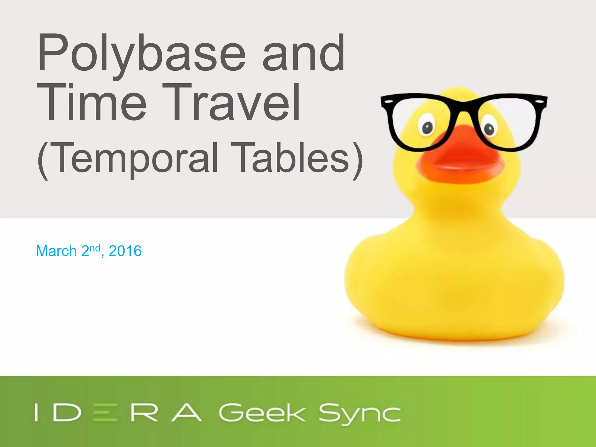 The document discusses advancements in data warehousing, particularly focusing on PolyBase and temporal tables in Microsoft SQL Server. It highlights PolyBase's ability to integrate data from Hadoop and Azure into SQL Server using T-SQL, and describes the structure and functionality of temporal tables for managing historical data. The content includes technical examples and configurations for utilizing these features effectively in a data management context.