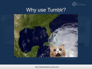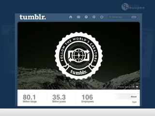 This document discusses Tumblr themes and theme development. It explains that Tumblr combines a traditional blog format with a social dashboard. It also outlines the basic ingredients of Tumblr themes including HTML, CSS, JavaScript, and Tumblr-specific theme operators. Finally, it provides resources for developing custom themes, integrating other services, and submitting themes to Tumblr.