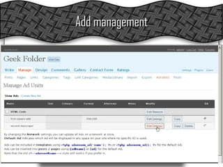 This document contains instructions for using various plugins to manage content on a website. It explains how to add audio players, Flickr photos, Next Gen galleries, and YouTube videos. It also describes how to schedule posts for future publication dates. The instructions are presented through a series of slides and include inserting codes, selecting options, and uploading files to customize features like slideshows, galleries, and audio playback.