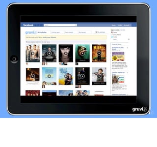 The Gruvi app aims to help users discover and share entertainment experiences by tapping into friends' recommendations on Facebook. It will recommend movies based on users' tastes, show what friends like, and help plan movie nights. This addresses a problem in the film industry where new movies have difficulty gaining exposure. Gruvi will identify early fans, engage them through campaigns, and track engagement metrics. This will help studios market films more effectively and deliver a return on investment. The app plans to expand across Europe and integrate with other services to reach users whenever they make film choices. Revenue projections show the company needs €250,000 to break even in Europe.