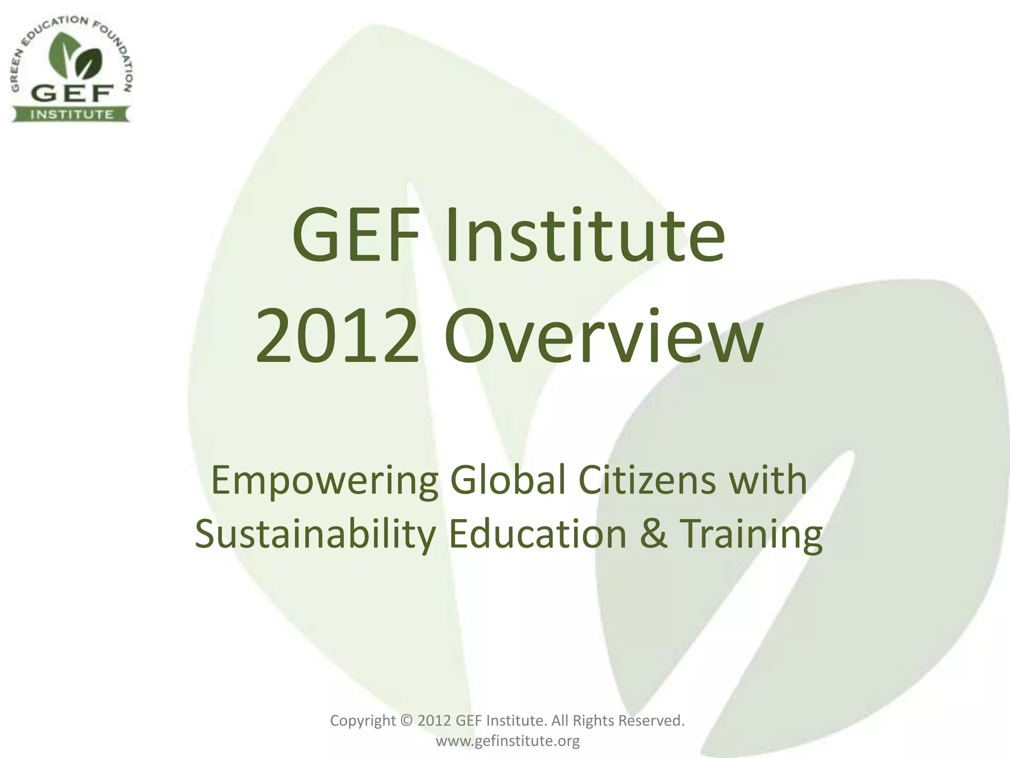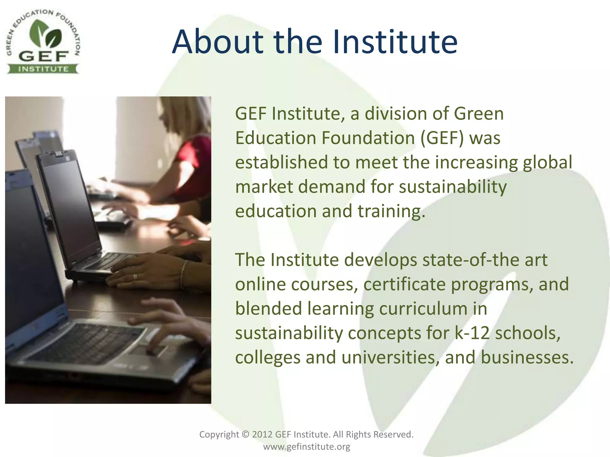 The GEF Institute offers sustainability education and training through online courses and certification programs tailored for K-12 schools, colleges, universities, and businesses. It features a Sustainability Partner Program allowing partner schools to access courses at low or no cost, along with additional resources. The courses utilize interactive methods and are designed to promote sustainability literacy and effective behavior change.