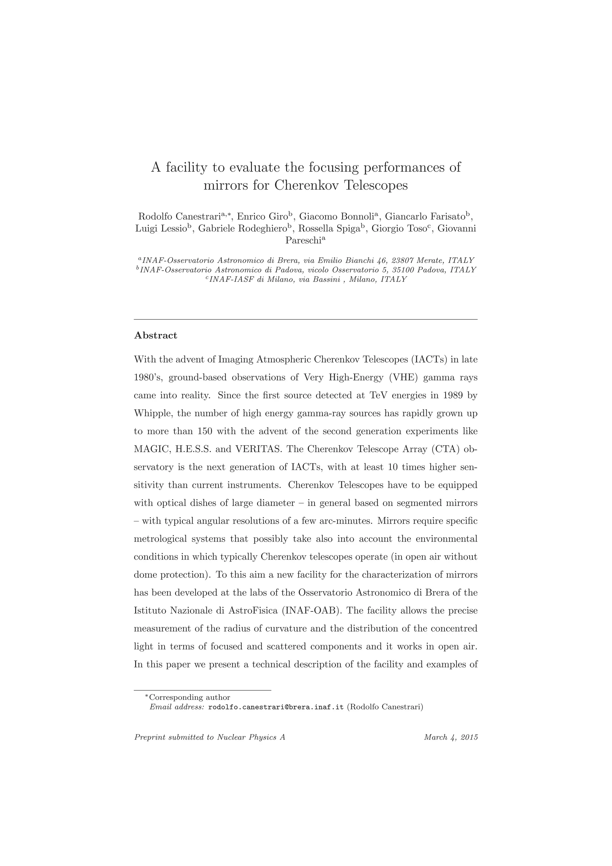 The document details the development of a facility at the INAF-OAB for evaluating the performance of mirrors used in Cherenkov telescopes, crucial for detecting very high-energy gamma rays. It describes the technical capabilities of this facility, which characterizes mirrors by measuring their curvature and light distribution in open-air conditions, simulating actual operating environments. This innovative setup is designed to improve the calibration process for mirrors used in the next generation of imaging atmospheric Cherenkov telescopes (IACTs).