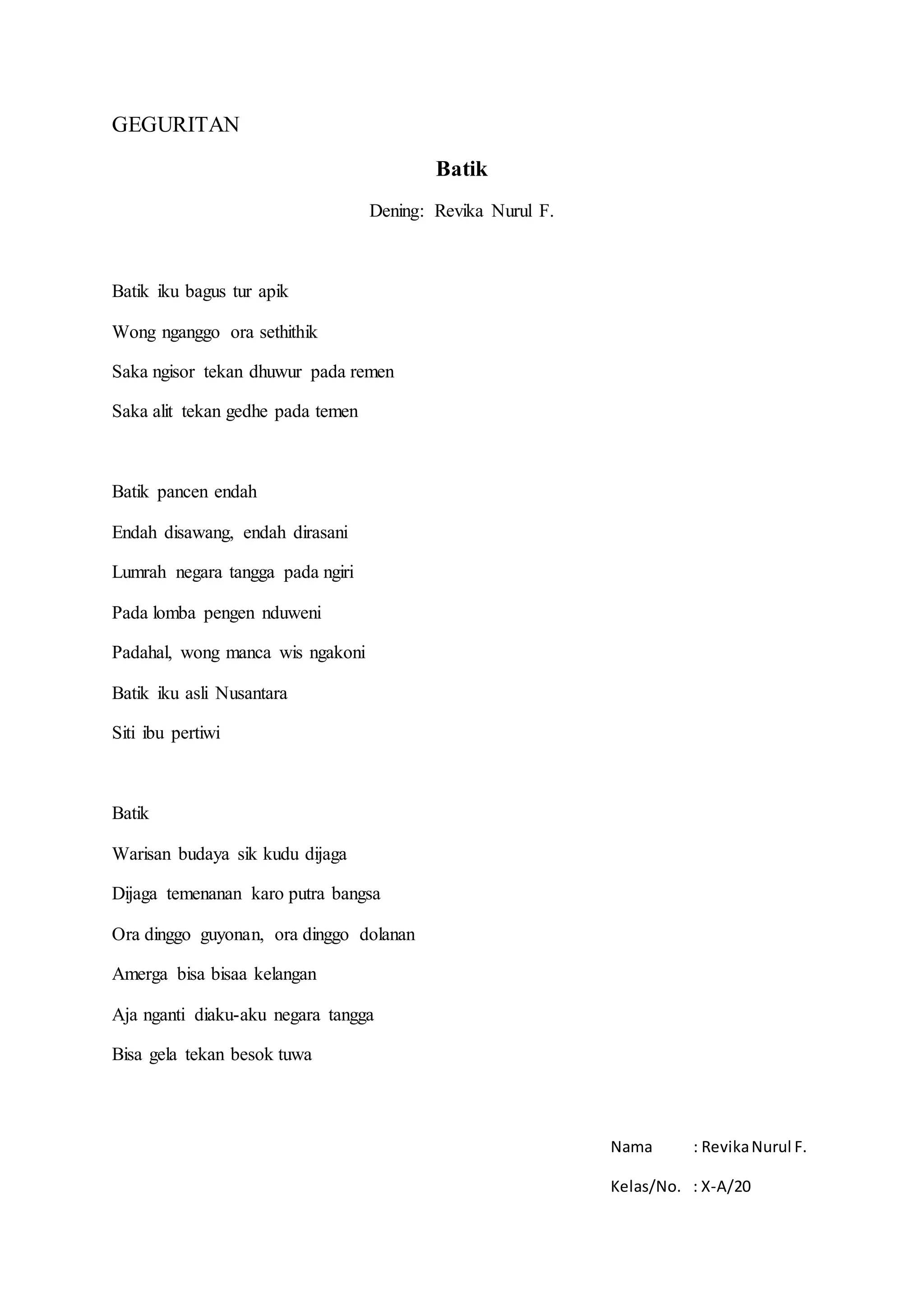 Batik merupakan warisan budaya Indonesia yang harus dijaga keasliannya. Batik telah menjadi kebanggaan Indonesia dan sering memenangkan lomba di tingkat internasional meskipun batik berasal dari Indonesia. Untuk melestarikan batik sebagai warisan budaya, masyarakat Indonesia tidak boleh meremehkan atau menganggap remeh batik.