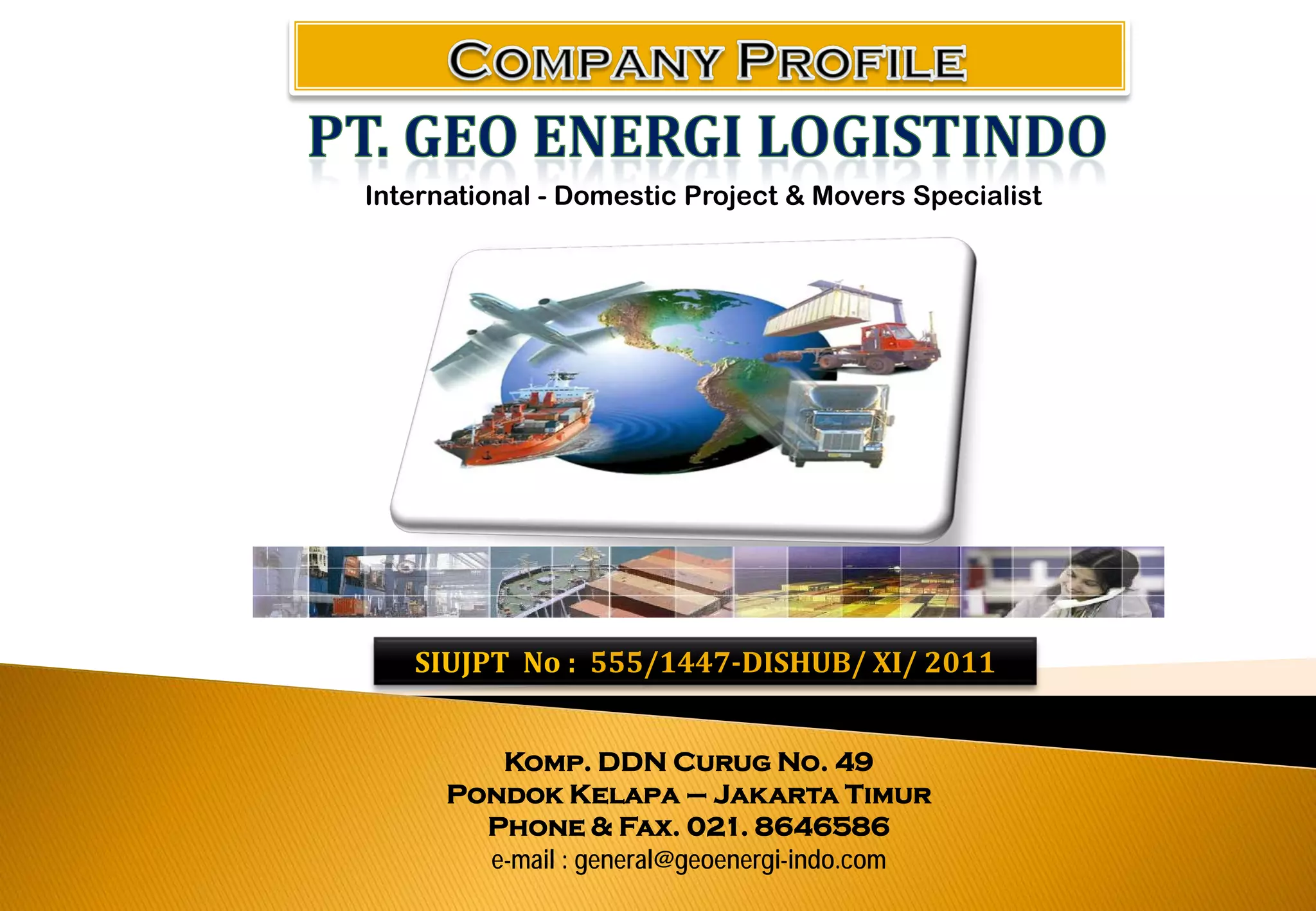 PT. Geo Energi Logistindo adalah perusahaan jasa pengurusan transportasi yang melayani pengiriman internasional dan domestik melalui laut, darat dan udara. Perusahaan ini didukung oleh jaringan maskapai pelayaran, vendor truking, dan agen perwakilan serta memiliki pengalaman dalam menangani proyek pengiriman dan distribusi ke seluruh Indonesia.
