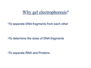 Gel electrophoresis is a technique used to separate DNA, RNA, and proteins based on their size and charge. During gel electrophoresis, a current is applied to move the molecules through a gel, with smaller molecules moving faster through the pores in the gel. This allows researchers to determine the size of unknown molecules by comparing their migration to molecules of known sizes. Key aspects of gel electrophoresis include preparing an agarose or polyacrylamide gel, loading samples and a ladder, running the current, and visualizing the separated molecules using dyes like ethidium bromide under ultraviolet light.