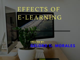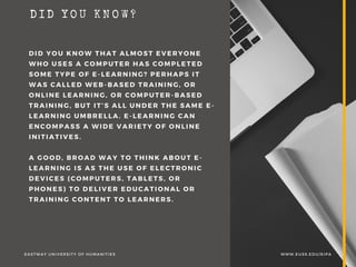 The document discusses e-learning, which is defined as learning that takes place using computers and the internet. It can encompass a variety of online initiatives using electronic devices like computers, tablets, and phones. Some benefits of e-learning include its convenience, ability to include rich media, repeatability, and easier monitoring of learner progress. Potential disadvantages include reliance on technology, incompatibility of some materials, unsuitability for certain types of training, high costs, reliance on IT skills, need for human support, and potential pedagogical issues.