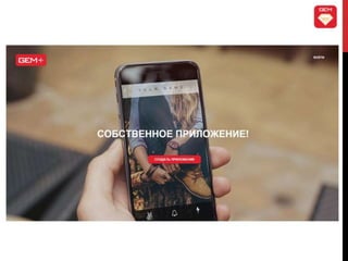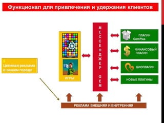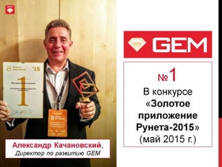 Документ описывает экосистему Gem как новый канал коммуникаций для бизнеса, предлагающий компании возможность достигать клиентов через мобильные приложения с низкой конкуренцией и высокой лояльностью пользователей. С ростом мобильных устройств и увеличением времени, проводимого пользователями в мобильных приложениях, Gem предоставляет компаниям стратегические преимущества, включая доступ к большому рынку и снижение затрат на привлечение клиентов. В результате, экосистема Gem позволяет бизнесу эффективно доносить свои предложения до потребителей и повышать рентабельность инвестиций.