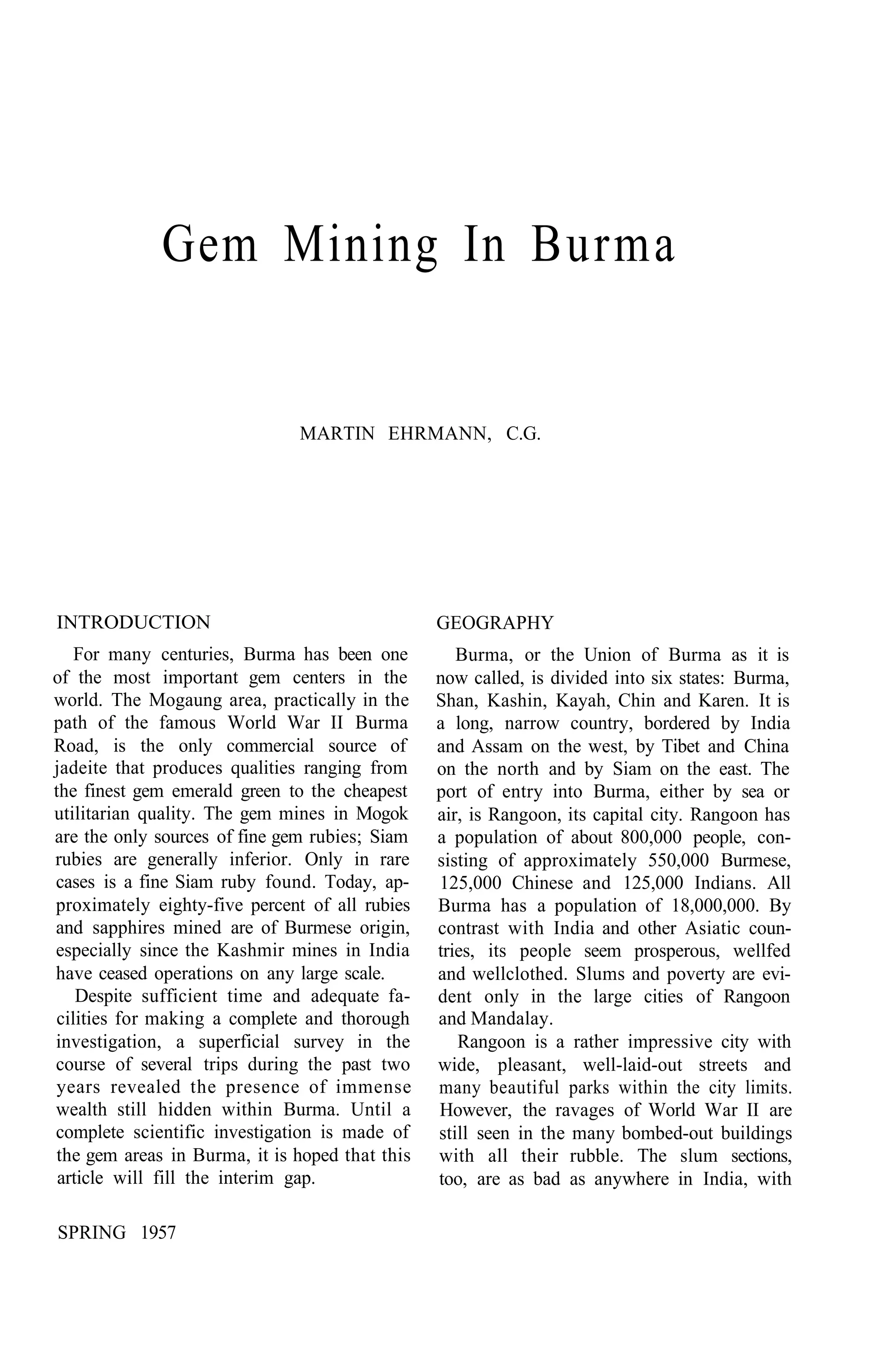 This document provides an overview of gem mining in Burma, specifically in the Mogok area. It describes the geography and climate of Burma and Mogok, and details the mining process. The main types of gemstones found in Mogok mines are rubies and sapphires, with over 85% of rubies and sapphires mined globally coming from Burma. Mining is done individually or by small operations, with about 1200 mines operating in the area. The people and culture of Burma and Mogok are also described.