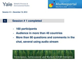 The document summarizes a webinar on improving land use management to mitigate climate change. It discusses that land use is a major source of greenhouse gas emissions and global demand for food and fiber is increasing. It then describes the Climate and Land Use Alliance's strategy to reduce emissions from deforestation by making grants and engaging stakeholders. An evaluation found the Alliance is well-organized but challenges include diminished prospects for REDD+ policies and the need to engage more with the private sector and ensure low-carbon plans are implemented. It means focusing on new pathways and ensuring work leads to follow through on adoption and implementation.