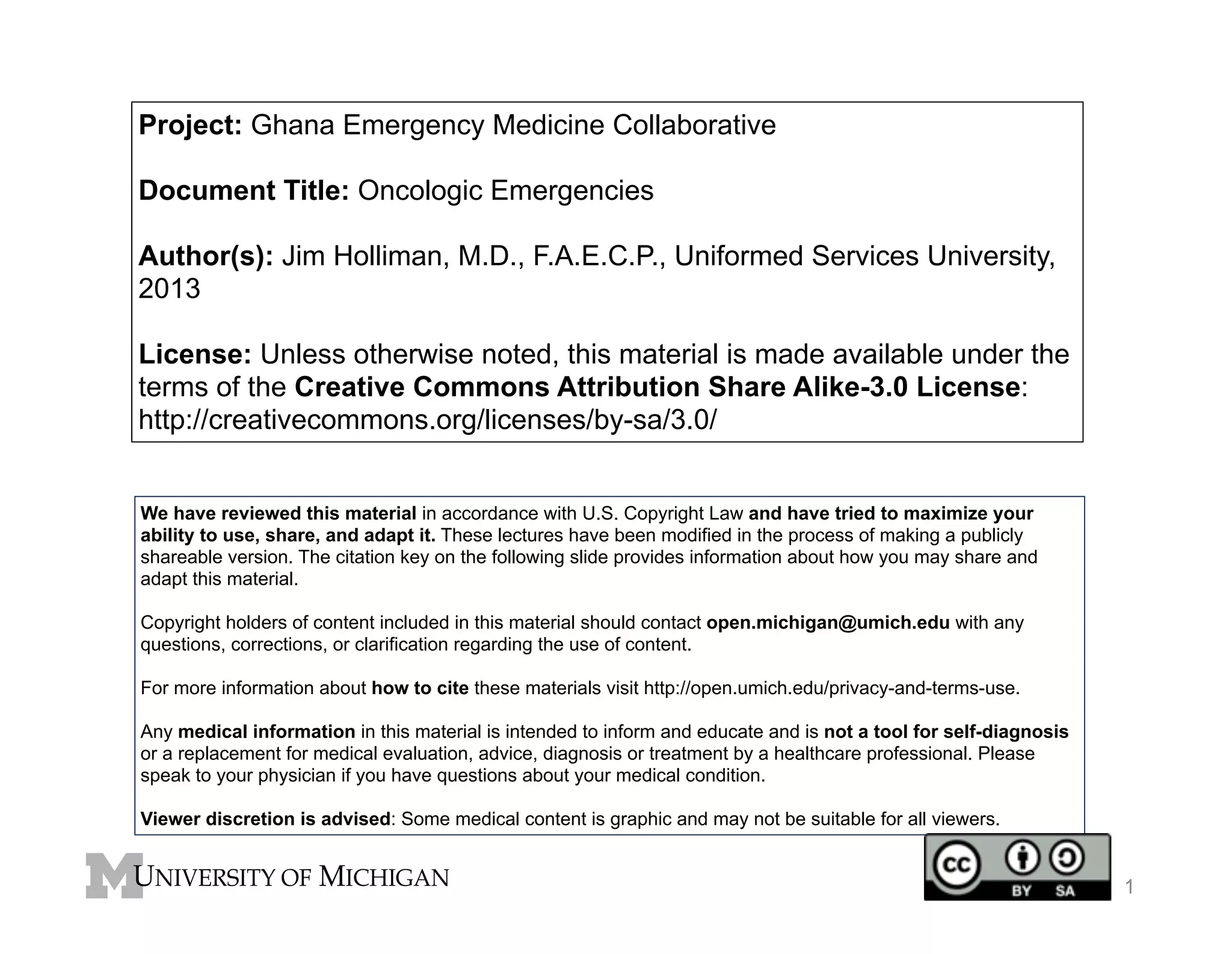 The document discusses oncologic emergencies, highlighting that malignancy is the second leading cause of death in the U.S. and the treatment of complications can significantly improve patient outcomes. It lists major emergency complications such as upper airway obstruction, malignant pericardial tamponade, and hypercalcemia, while detailing their symptoms, diagnosis, and treatment options. The content also emphasizes the importance of proper medical intervention and the potential for life-saving procedures in managing these emergencies.