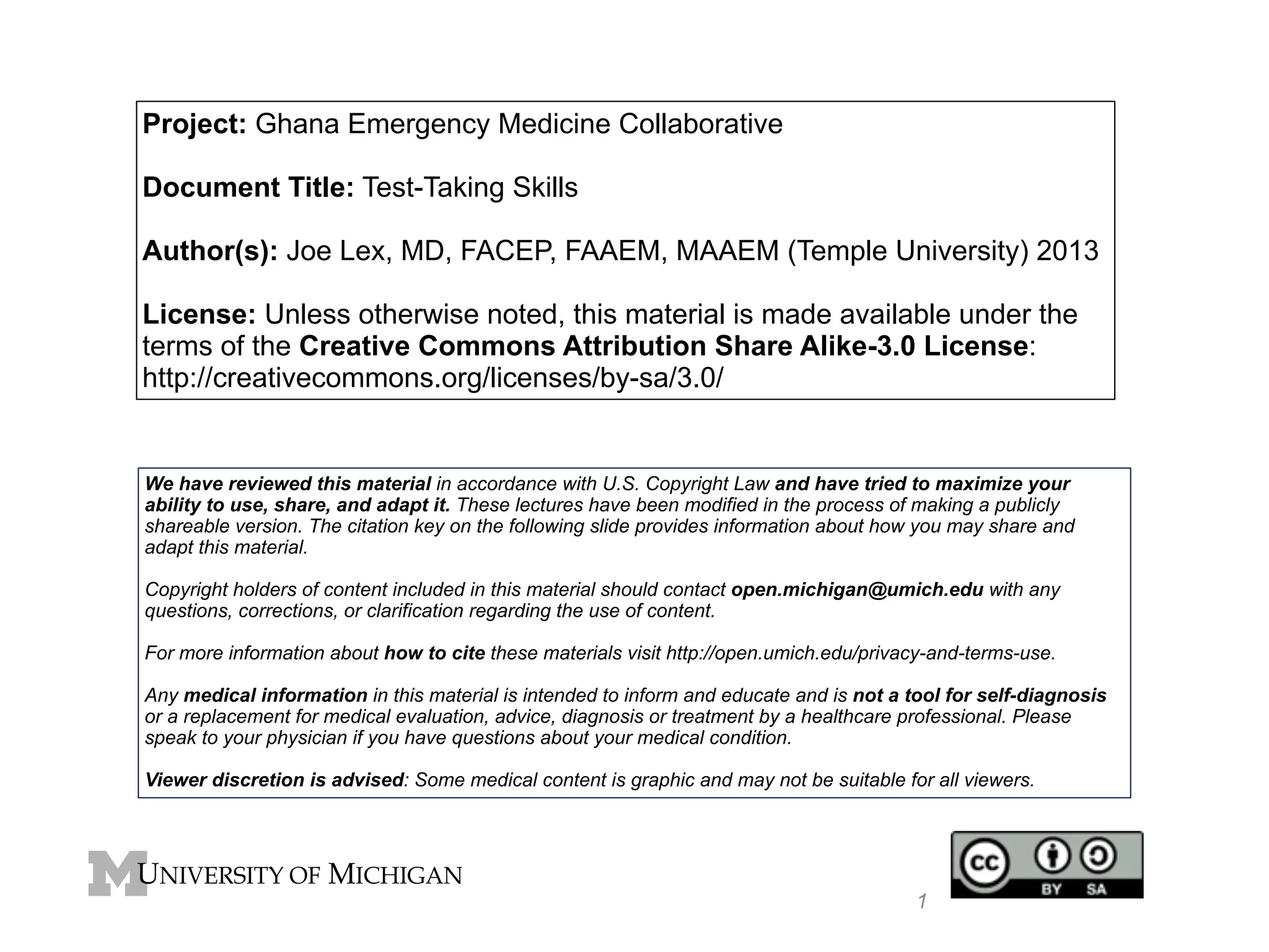 This document provides guidance on test-taking skills specifically for emergency medicine examinations. It emphasizes the importance of understanding the structure and content of tests, strategies for answering questions, and addressing test anxiety. The author, Joe Lex, offers practical tips to improve test performance and highlights the significance of preparation and confidence.