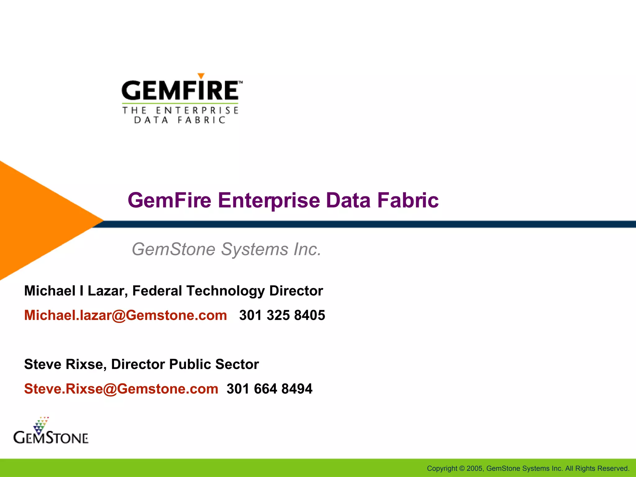 GemFire Enterprise Data Fabric provides a scalable and high-performance data infrastructure that caches and distributes data across multiple formats and distributed applications. It connects to backend systems, provides high data availability, supports distributed transactions and querying. GemFire solves challenges in SOA and distributed systems by enhancing scalability, performance and reliability while potentially reducing hardware and software costs.