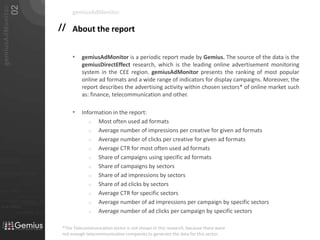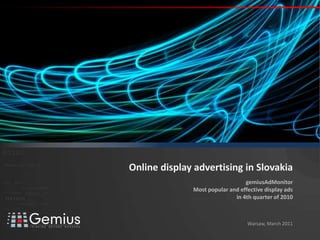 The document summarizes an analysis of online display advertising in Slovakia in the fourth quarter of 2010. It finds that the most common ad formats were 300 x 300, 468 x 300, and 250 x 250. The format with the highest click-through rate was 468 x 300 at 0.55%. Finance and automotive sectors accounted for the largest shares of campaigns at 34% and 13% respectively. The finance sector also generated the largest share of impressions at around one-third.