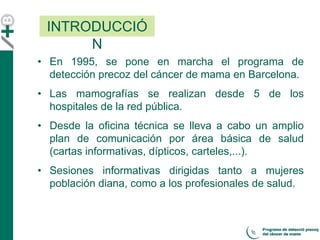 El documento analiza la percepción y valoracion de los profesionales de salud sobre el programa de detección precoz del cáncer de mama en Barcelona, iniciado en 1995. A través de una encuesta realizada en 2008, se evaluó el conocimiento, implicación y opinión de los profesionales, hallando un alto grado de satisfacción pero también áreas de mejora en aspectos de comunicación y organización. Las recomendaciones de los encuestados sugieren un aumento en la difusión mediática y mayor coordinación entre equipos de salud.