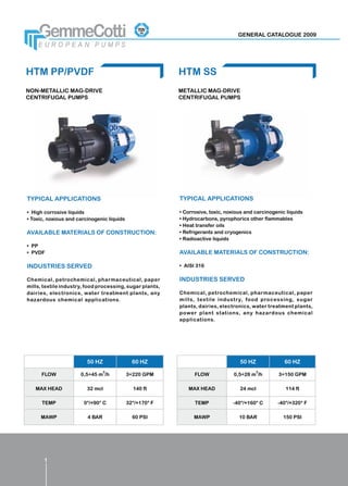 This document appears to be a catalogue for centrifugal pumps and other equipment suitable for handling corrosive and hazardous liquids. It includes non-metallic and metallic models of mag-drive centrifugal pumps, regenerative turbine pumps, vane pumps, and liquid ring vacuum pumps. The pumps are available in various thermoplastic and metal materials to suit applications in chemical, petrochemical, pharmaceutical, and other industries involving corrosive or toxic liquids. Performance specifications are provided for each pump type.
