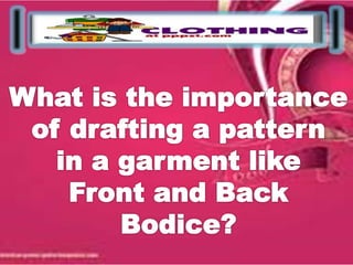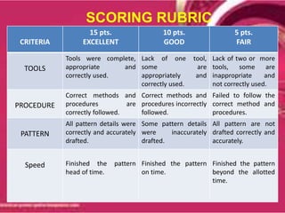 The document provides instructions for drafting a front and back bodice pattern, including defining bodice, listing key bodice measurements, and presenting a scoring rubric. Students are given 10 minutes to draft the patterns using the appropriate tools and procedures. The rubric assesses students on tools used, following procedures correctly, accuracy of pattern details, and timeliness of completion. Drafting patterns is valued as it teaches garment construction.