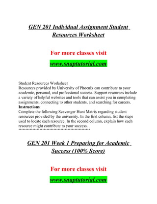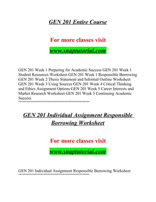 The document outlines the curriculum and assignments for the GEN 201 course at the University of Phoenix, including topics like academic success, responsible borrowing, thesis development, and critical thinking. It provides detailed instructions for various worksheets and assignments designed to help students assess their academic readiness, explore career interests, and apply critical thinking in ethical contexts. Students are encouraged to utilize university resources and engage in research to enhance their learning experience and professional development.