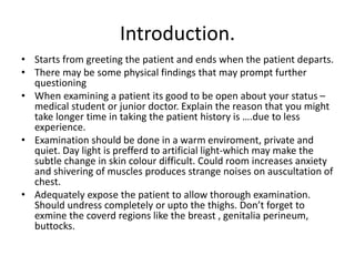 This document provides guidance on performing a thorough physical examination of patients. It discusses examining various body systems including the neck, hands, lymph nodes, skin, legs/feet, and breasts. Key points include examining patients in a private, well-lit environment; using a chaperone for intimate exams; observing posture, gait and interactions; assessing nutrition status; and being attentive to signs like odors, swelling, and lesions that may provide diagnostic clues. Examinations should be performed systematically while prioritizing patient comfort.