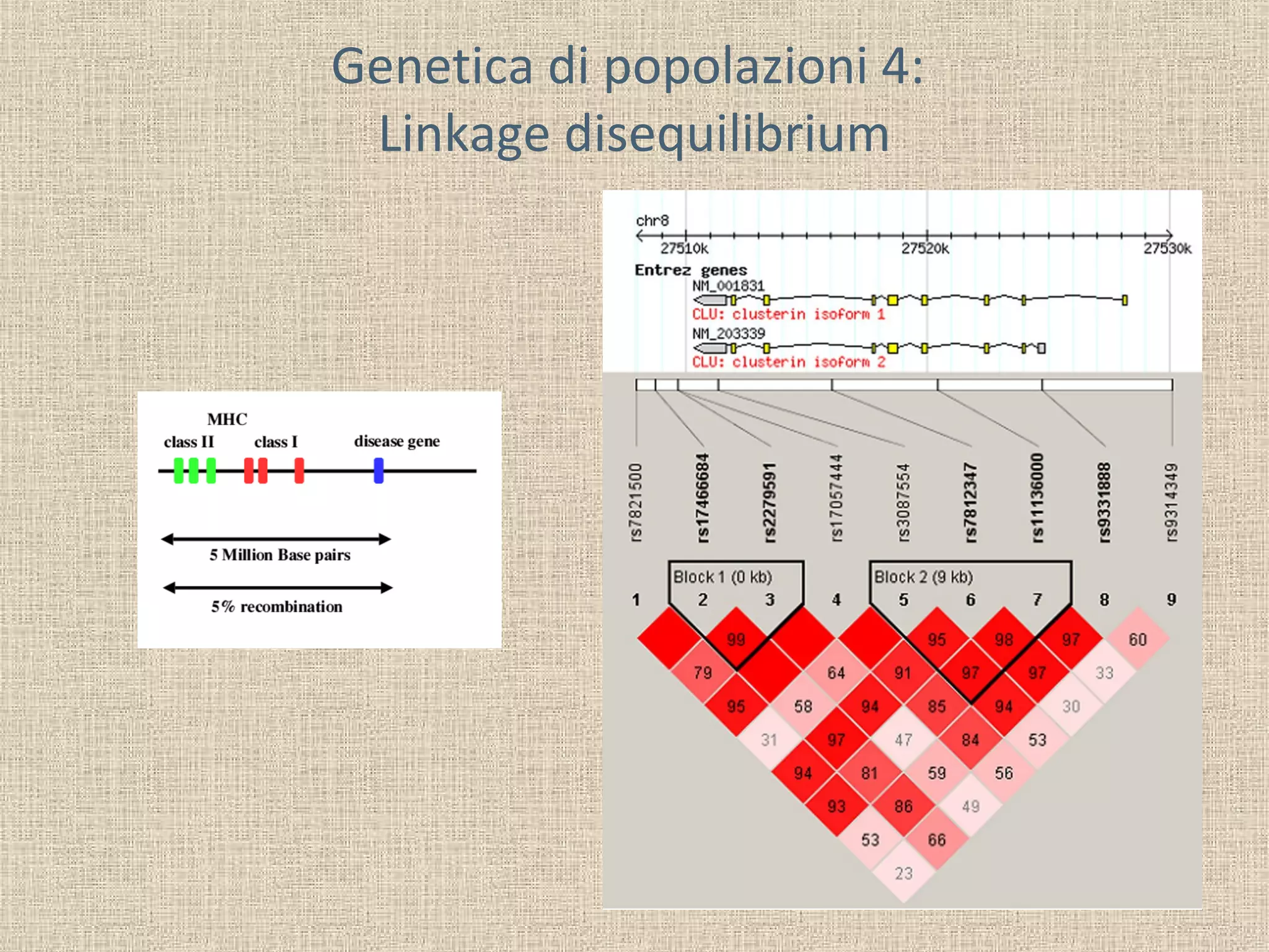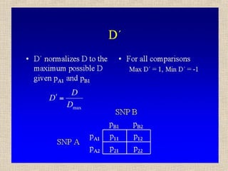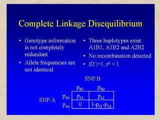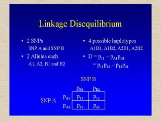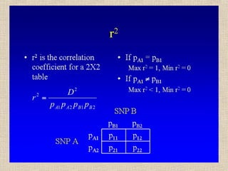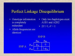 Il documento tratta della genetica di popolazioni, focalizzandosi sul linkage disequilibrium (LD) e i suoi fondamenti, come l'equilibrio di Hardy-Weinberg, la mutazione e la ricombinazione. Descrive come il LD e la sua riduzione nel tempo dipendano dai tassi di ricombinazione e dal numero di generazioni, sottolineando l'importanza dei aplotipi. Inoltre, evidenzia che, mentre l'equilibrio di Hardy-Weinberg può essere raggiunto rapidamente, il linkage equilibrium richiede più tempo e può essere analizzato tramite diverse statistiche.