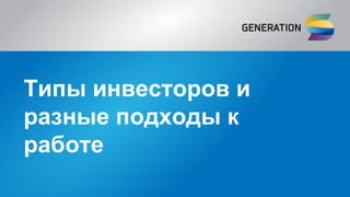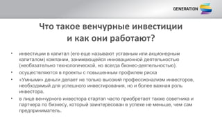 Документ описывает венчурные инвестиции, их этапы и типы инвесторов, таких как бизнес-ангелы и венчурные фонды. Он акцентирует внимание на важности наличия бизнес-плана, стратегий и сильной команды для успешного привлечения инвестиций, а также дает советы по переговорам с инвесторами. Также указаны различные источники финансирования на каждом этапе развития стартапа и значимость наличия собственного капитала на старте.
