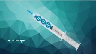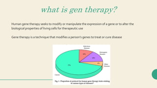 Gene therapy seeks to modify or manipulate genes to treat diseases. There are three main strategies for gene therapy: gene augmentation therapy which introduces a normal gene to compensate for an abnormal gene, targeted killing of specific cells, and targeted inhibition of gene expression. Gene therapy can be somatic, affecting most body cells, or germline, affecting eggs or sperm. Viral vectors are commonly used to deliver genes into cells, but non-viral methods also exist. Gene editing tools like ZFNs, TALENs, and CRISPR-Cas systems can also be used to precisely alter genes.