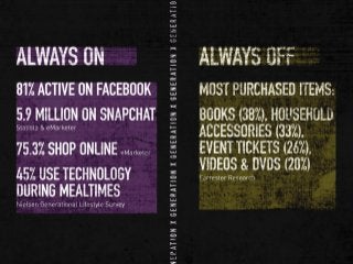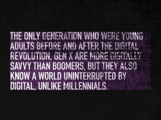 This document provides an overview of Generation X, those born between 1966-1981. It discusses how Gen X grew up during a time of societal upheaval and lacked clear role models. As they came of age, Gen X developed an anti-authoritarian identity and ethos. Though often overlooked between the larger Baby Boomer and Millennial generations, Gen X has come to wield influence through leadership positions and pioneering new industries. The document examines Gen X's financial situation, career paths, cultural impact, and relationship to technology as they approach age 50.
