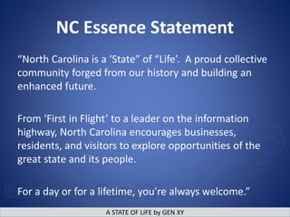 The document presents a branding proposal for North Carolina called "A State of Life" created by Gen XY. It outlines the brand essence, personality, and promise. The brand promise targets businesses, residents, and visitors. For businesses, it highlights NC's growing population, economic rankings, low costs and opportunities in technology and other industries. For residents, it emphasizes quality of life factors like weather, education, culture and recreation. It proposes implementing the brand internally and through a logo, television ads, and social media featuring people saying "I'm NC."