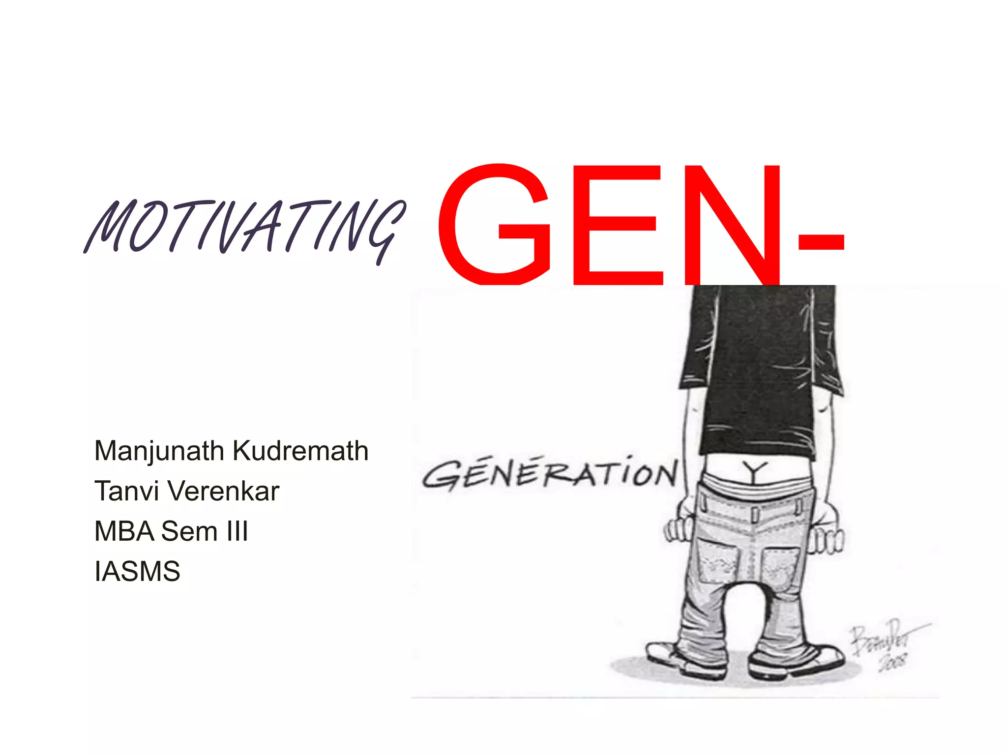 This document summarizes the key generational cohorts from Traditionalists to Generation Y and some of their defining characteristics and influences. It discusses that Traditionalists were born before 1946 and influenced by World War 2 and the Great Depression, valuing loyalty and legacy. Baby Boomers were born 1946-1964 and influenced by civil rights movements, being competitive and focused on themselves. Generation X was born 1965-1980 and influenced by new technologies like MTV and the rise of AIDS, valuing independence. Generation Y was born after 1980 and influenced by the internet and social media, feeling empowered and valuing diversity, change and work-life balance. It provides tips for motivating Generation Y by providing a collaborative, fun work environment with recognition and challenges