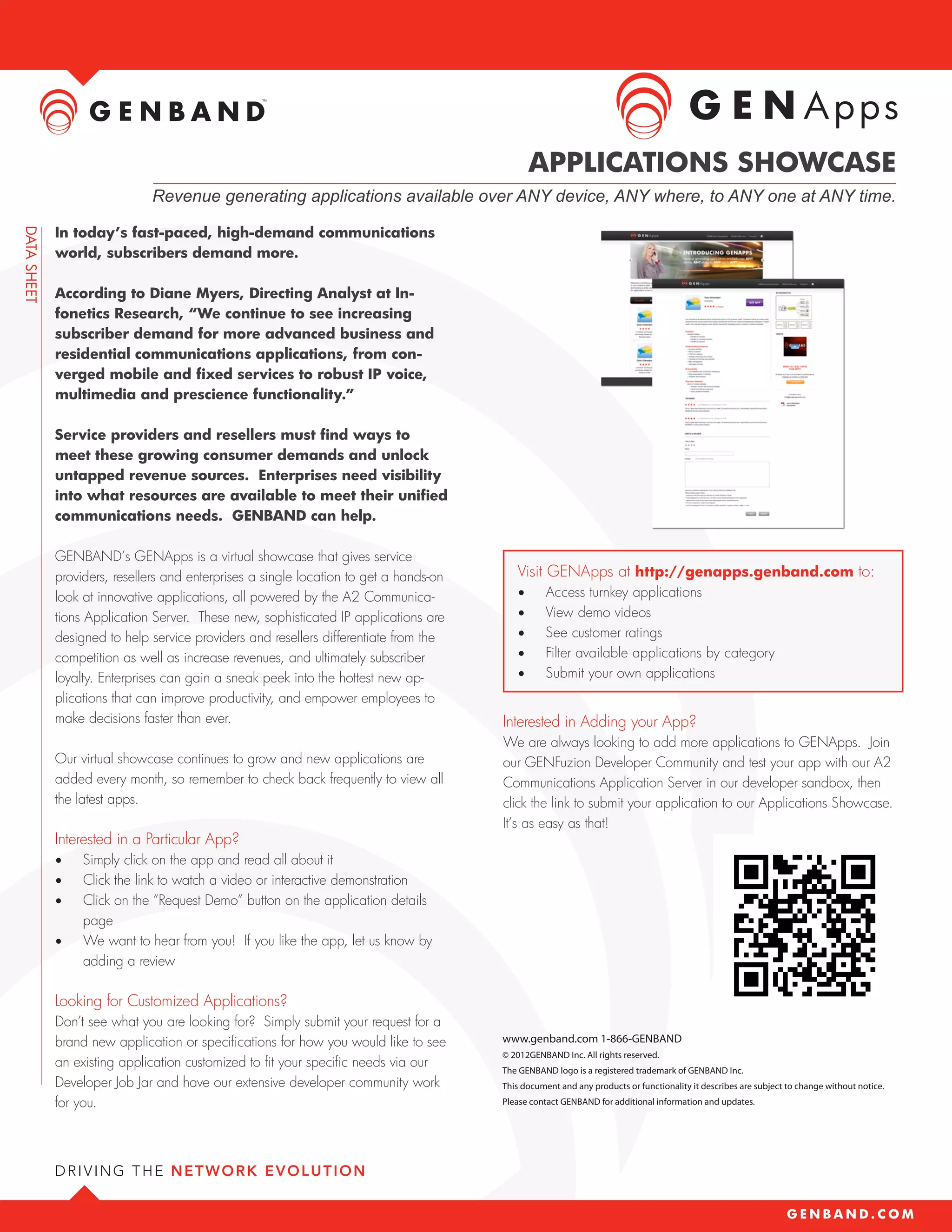 Genapps by Genband offers a virtual showcase for service providers and enterprises to explore innovative revenue-generating applications for communication needs. It features a range of advanced business and residential applications, enhanced by demo videos and customer ratings, aiming to improve productivity and subscriber loyalty. The platform encourages participation from developers, allowing them to submit applications or request custom solutions to meet specific requirements.