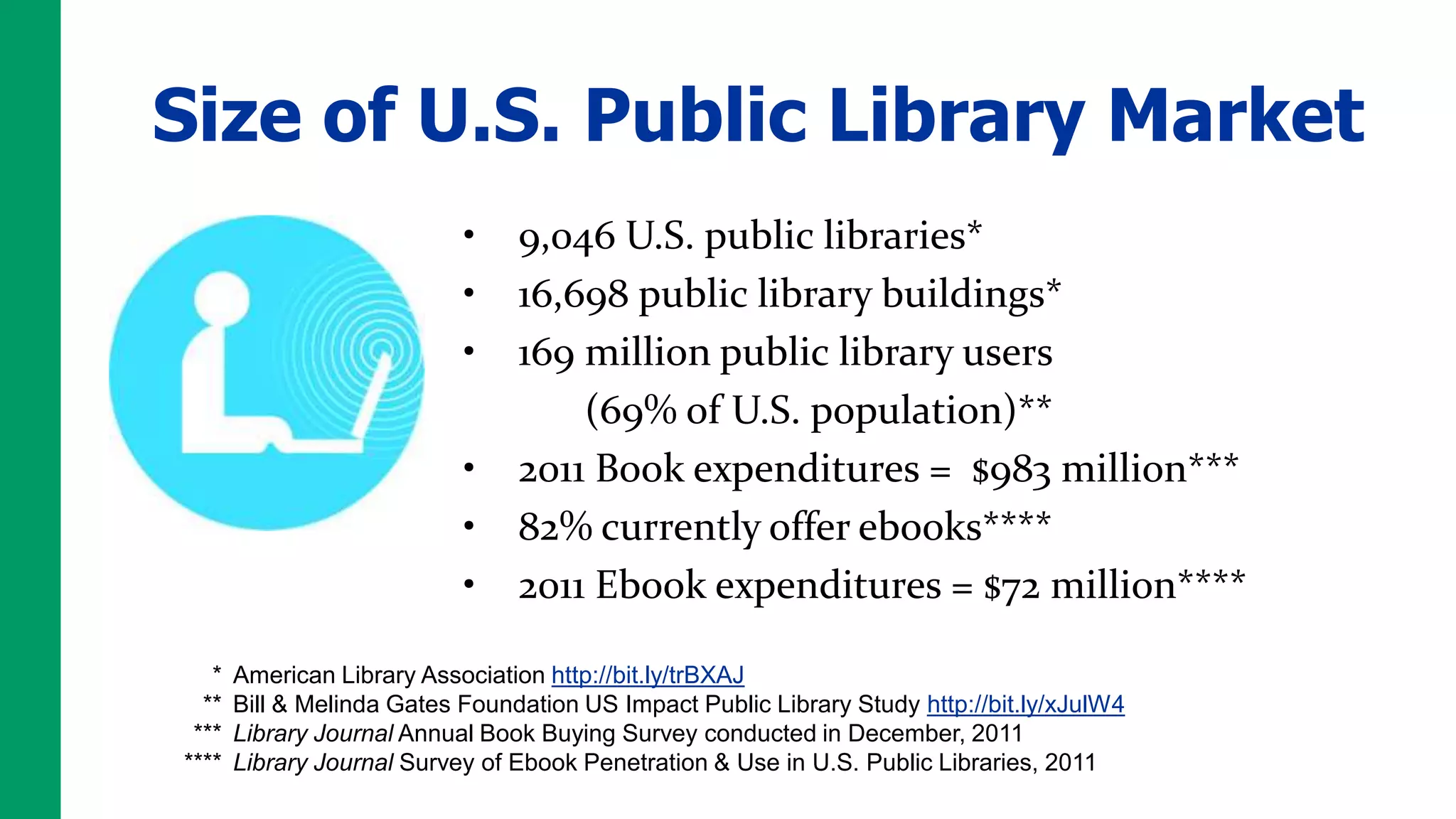 The document discusses research on U.S. public library users and their behaviors and preferences. It provides statistics on the size of the U.S. public library market with over 9,000 libraries and 169 million users. Known as "Power Patrons", frequent library users (weekly visits) tend to be middle-aged women with a college education. Power Patrons use libraries to borrow books, browse shelves, and search the catalog. The research also finds that library patrons purchase books, especially ones they previously borrowed, and consume content in print, ebook, and audiobook formats. Many patrons want more ebooks available from their public library.