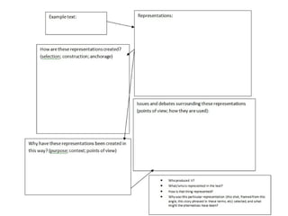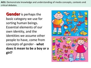 The document discusses representations of gender in media. It begins by outlining traditional gender ideologies that presented masculinity as superior and defined strict gender roles. It then discusses how feminism challenged these patriarchal views and pushed for more equal representations. However, recent trends suggest a move back towards more traditional gender roles. The document analyzes how media represents and reinforces stereotypical attributes of masculinity and femininity through binaries like alpha/beta males and madonna/whore females. It also discusses theorists like Judith Butler who view gender as a social construct rather than fixed attributes.