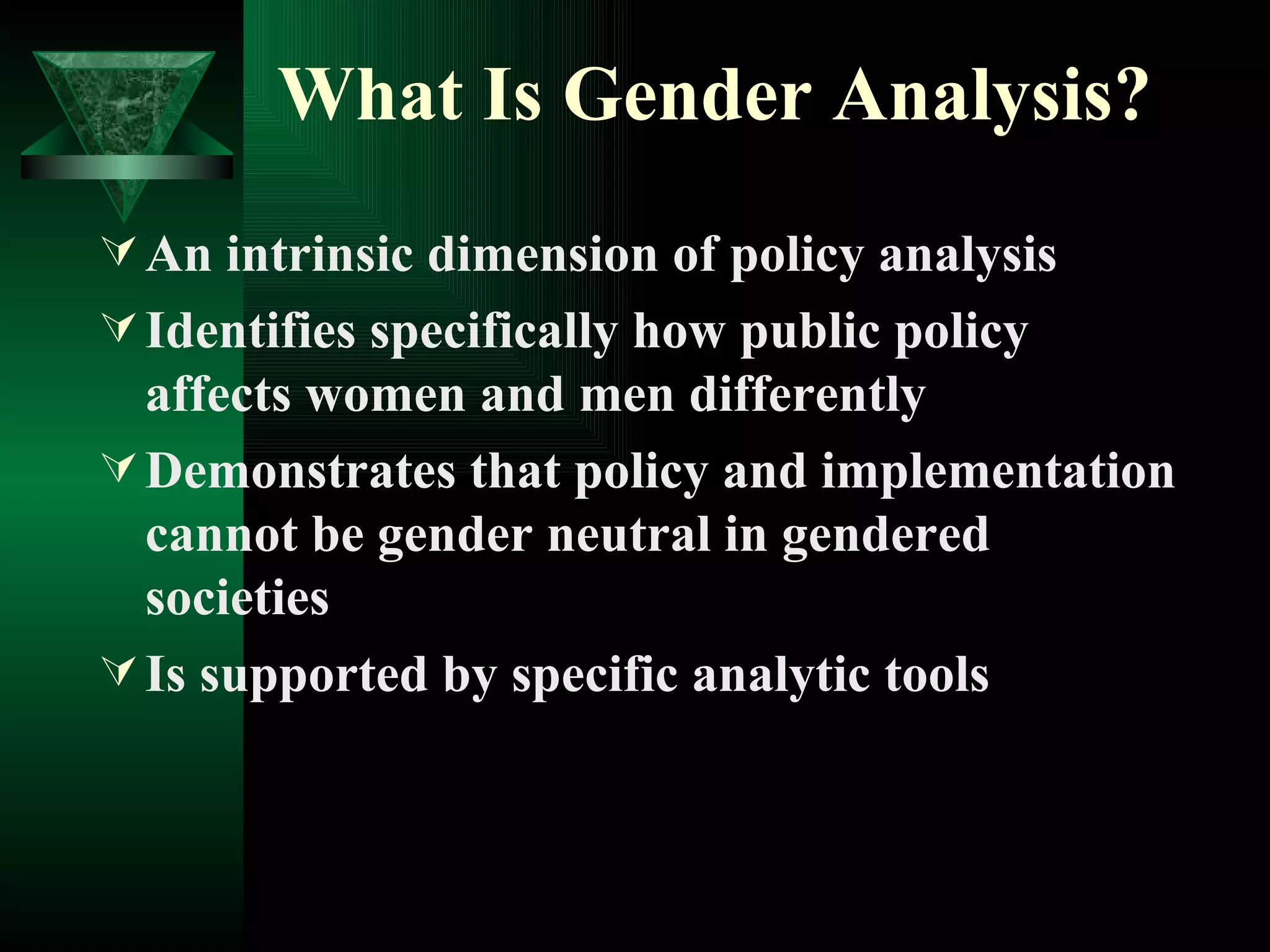 The document discusses several gender analysis frameworks that can be used to assess how policies, programs, and projects differentially impact men and women. It describes frameworks like the Harvard Analytical Framework, Moser's triple roles framework, and Longwe's Women's Empowerment Framework. Each framework asks different questions to analyze factors like who does what work, who has access to and control over resources, and how interventions may affect gender roles, status, and responsibilities.