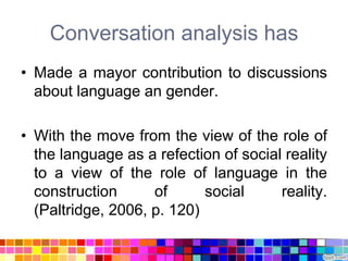 The document discusses gender and conversation analysis. It explains that conversation analysis has contributed to discussions about language and gender by viewing language as constructing social reality rather than just reflecting it. Conversation analysis reveals how gender is constructed through social interaction and can account for gender as a relevant feature. The analysis of conversations can help uncover aspects of gendered interaction. Membership categorization analysis examines how people use social categories to classify individuals and make inferences about their typical activities.
