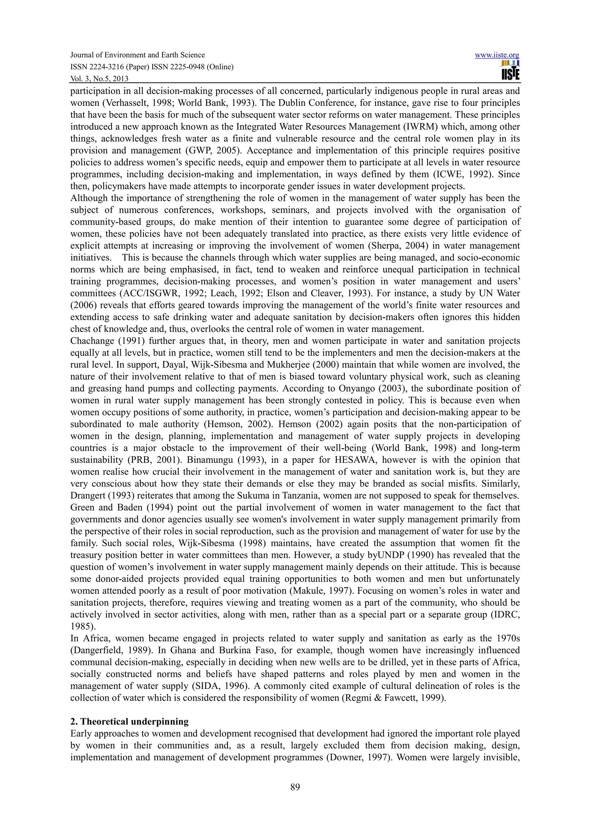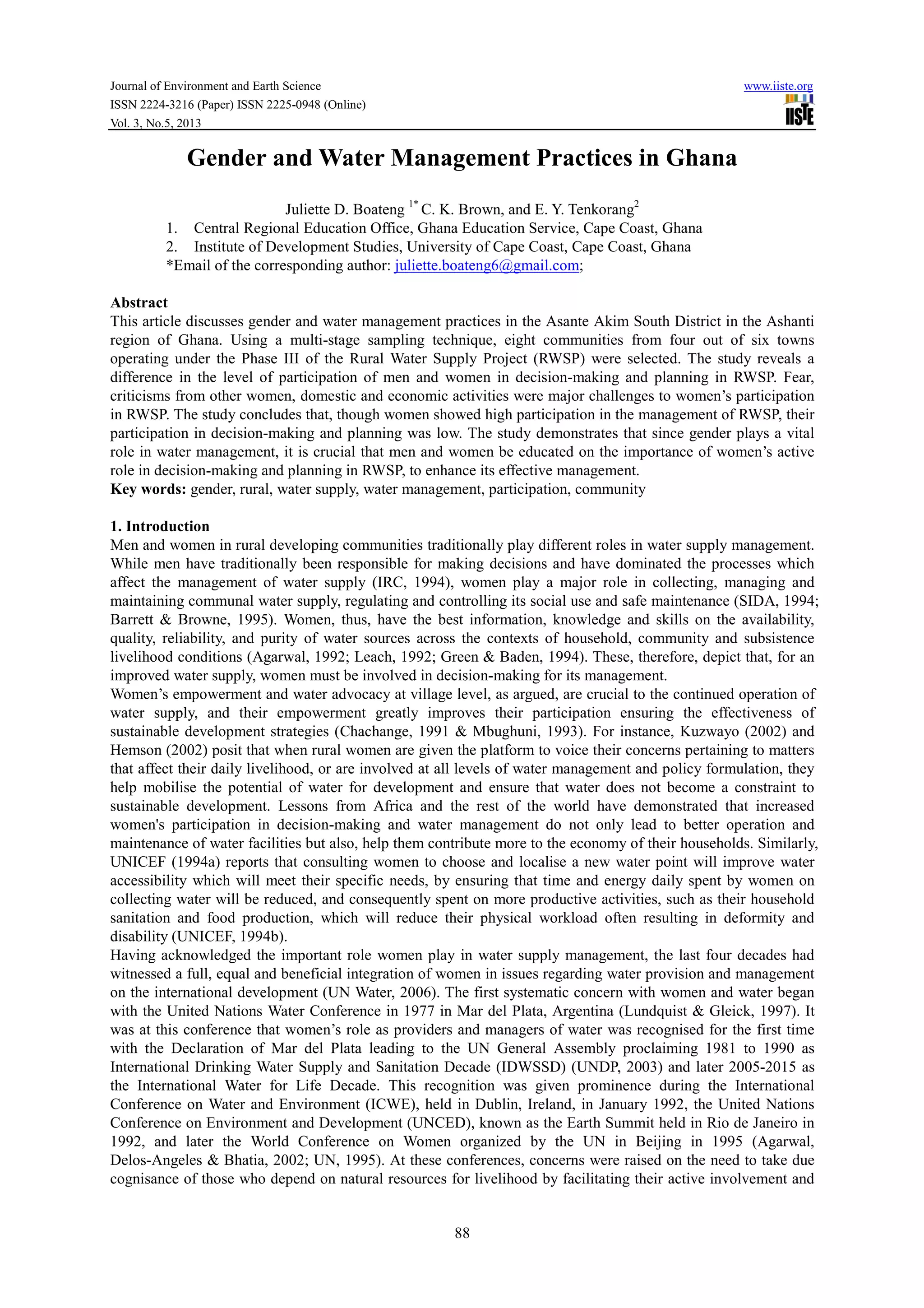This document discusses gender roles in water management practices in rural Ghana. It finds that while women play a major role in collecting, managing, and maintaining water supplies, their participation in decision-making and planning for water projects is low. Men traditionally dominate decision-making processes. The study concludes that educating both men and women on the importance of women's active participation in decision-making can help enhance effective management of water resources.