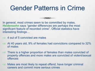 This document discusses gender patterns in crime based on official statistics and sociological theories. The key points are: