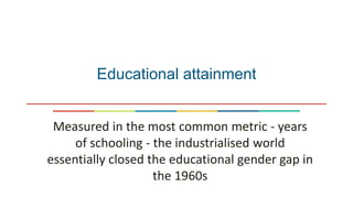 The document analyzes gender differences in educational attainment and performance, highlighting that the educational gender gap was effectively closed in the industrialized world by the 1960s. It reveals that while girls are more likely to report low self-efficacy in science and experience anxiety towards mathematics, boys tend to perform better in science, particularly at higher achievement levels. Furthermore, it emphasizes the need for targeted efforts from parents, teachers, and employers to address these disparities and inspire careers in STEM fields among both genders.