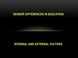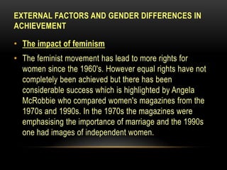 This document discusses internal and external factors that influence gender differences in educational achievement. Externally, changes in family structure, women's employment opportunities, and girls' changing ambitions have encouraged girls to pursue higher education and see their future as more independent. Internally, equal opportunity policies, more female teachers and role models, changes to assessment like coursework, and efforts to challenge stereotypes in curricula have helped narrow the gender gap or favor girls in some cases. However, radical feminists argue that schools remain patriarchal and limit girls' full potential.